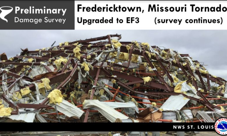 Update: This tornado near Fredericktown, MO has now been upgraded to an EF-3. Here is some damage that was recently rated EF-3. The survey continues and updates will be issued if more intense damage is discovered. #mowx https://t.co/nfLQVEcmS2 pic.twitter.com/DHdBJSbzLf