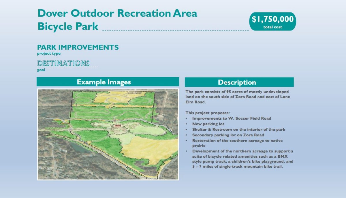 Joplin submitted plans for park development of nearly 100 acres south of Zora Avenue and east of Lone Elm Road that will include bicycle-related amenities such as a BMX style pump track, a children’s bike playground, and 5 – 7 miles of single-track mountain bike trail.