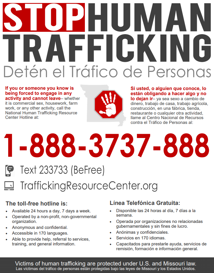 “Human trafficking is the exploitation of vulnerable people that can include kidnapping, forced labor, and commercial sexual exploitation, and it happens in Missouri, just as it does in other states” Public Safety Director Sandy Karsten said. “We hope these posters not only help lead human trafficking victims to assistance, but help spread awareness about this terrible crime that affects people across our country.”