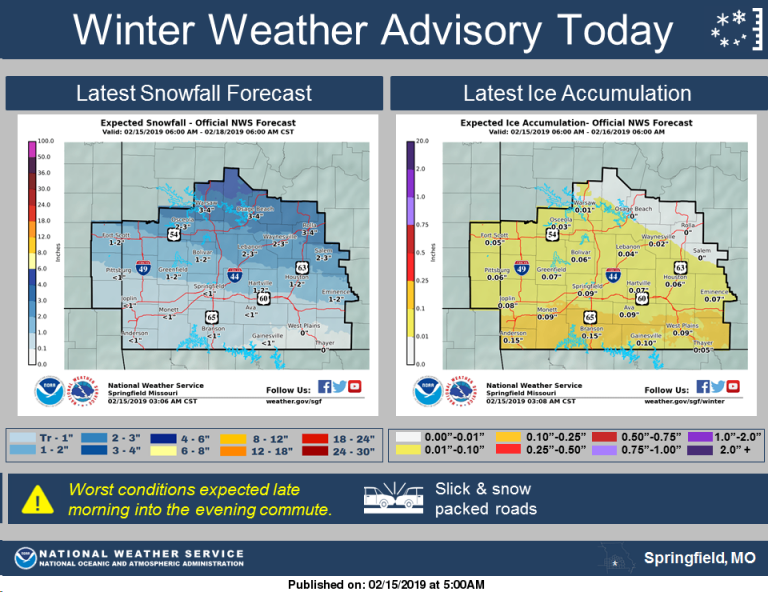 KZRG Chief Meteorologist John Wetherbee says total snow and sleet accumulations will range from a dusting near the Arkansas border, to 2 to 4 inches over central Missouri. Ice accumulations will range from a glaze, up to two tenths of an inch along the Arkansas border. Heaviest accumulations will occur from late morning into the afternoon hours.