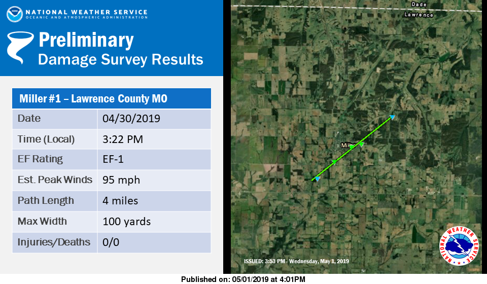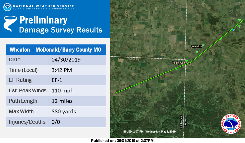 The weather service also confirmed an EF-0 tornado near Purdy damaged several outbuildings and trees. Law enforcement also reported brief touchdown of tornado 3 miles southeast of Exeter.