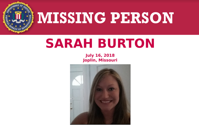 The FBI announcing today they are offering a reward of $5,000 for information leading to the arrest and conviction of the individual(s) responsible for the disappearance of Sarah Burton. She's been missing since July 16th in the vicinity of 10th Street and Rex Avenue in Joplin. There have been no reported sightings or contacts from Sarah since her disappearance. The FBI KC Division is assisting the Joplin Police Department with the investigation. If you have any information contact Joplin PD at 417-623-3131 ext. 440.