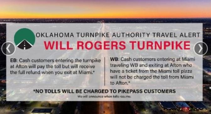 The Oklahoma Turnpike Authority announcing they're suspending the toll on the Will Rogers Turnpike between Afton and Miami due to the emergency declaration issued for ongoing flooding. Cash customers who enter going east from Afton will pay the toll but will get a full refund when they exit at Miami. Those getting on the Interstate going west at Miami will get a refund when they exit at Afton. You must keep your ticket for a refund. This goes for an unspecified amount of time. Tolls will be waived for Pikepass customers who travel between the two towns.