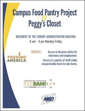 The Food Pantry and Peggy’s Closet are open on Monday through Friday from 8 a.m. until 4 p.m. For more information, students can visit the Center for Academic Success and Advisement in the basement of the Library/Administration Building or call 918-540-6004.