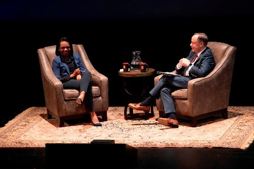 During a “fireside chat” in two armchairs on the stage, Scott asked Rice questions ranging from her stance on intercollegiate athletics to her view on the impeachment proceedings to her recently published book, “To Build a Better World.”