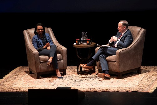 During a “fireside chat” in two armchairs on the stage, Scott asked Rice questions ranging from her stance on intercollegiate athletics to her view on the impeachment proceedings to her recently published book, “To Build a Better World.”