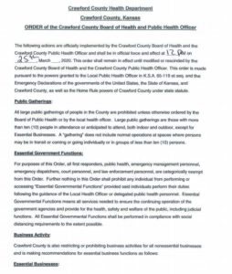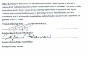 Crawford County Kansas is closing some non-essential businesses and putting restrictions on others due to coronavirus concerns.