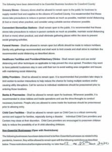 Non-Essential Businesses allowed to remain open but with restrictions include parts stores/lumber yards/hardware stores, bars/restaurants, manufacturing, agriculture business, automotive repair shops and other retail sales.