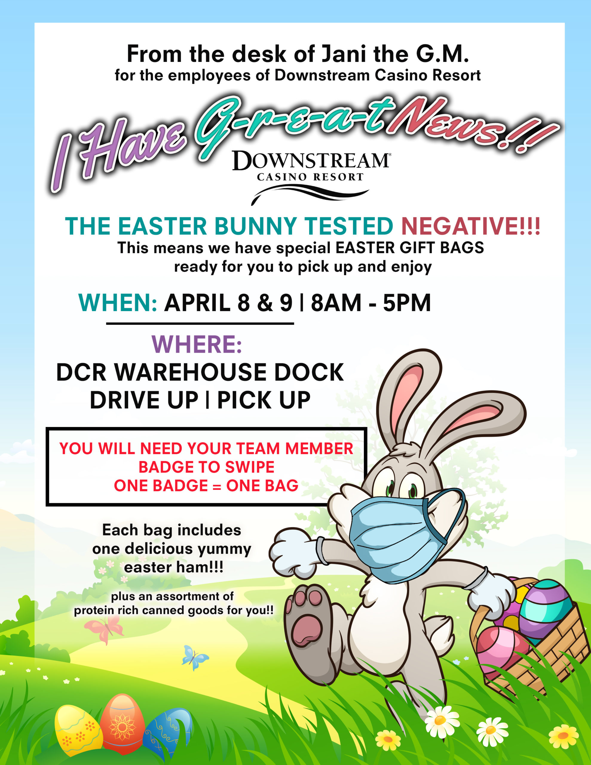 Wednesday, April 8th and Thursday, April 9th from 8 a.m to 5 p.m they’re hosting a drive-up service for employees and members to receive an Easter ham and canned goods at the Downstream Casino Resort Warehouse. Employees will have to show their badge.