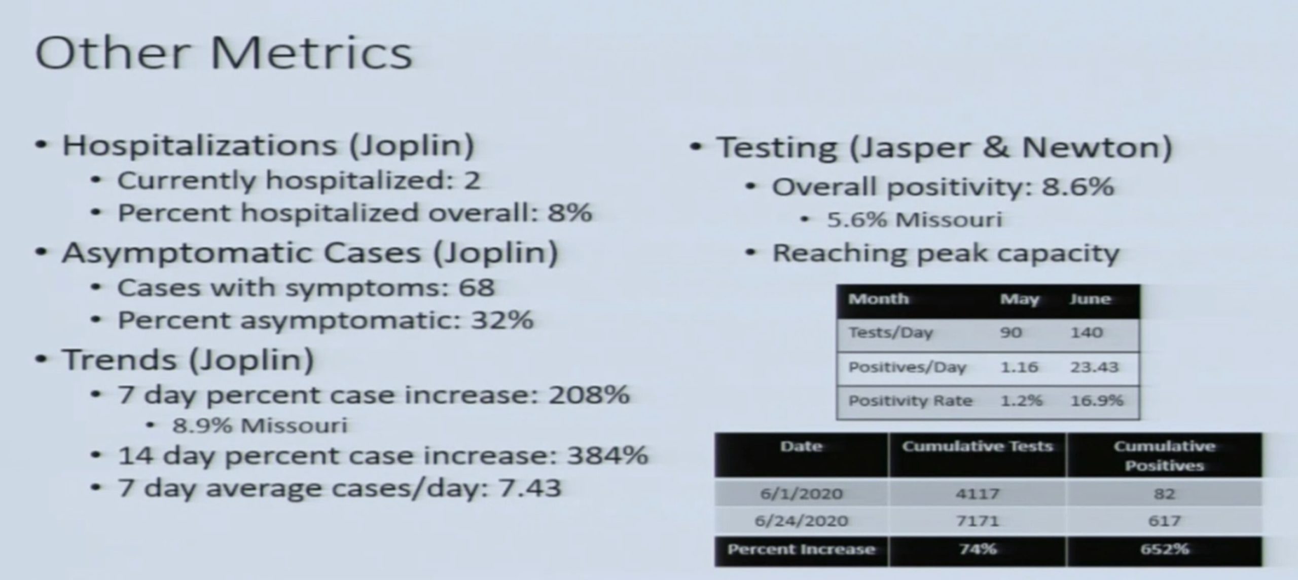 This comes as Joplin is now reporting a total of nearly 100 cases of the virus since the pandemic began in mid-March. Last weekend, the Joplin metro area was ranked as one of the nation’s top hotspots for increases in COVID-19 cases. Jasper County has seen its first death from the virus, a man in his 70s.