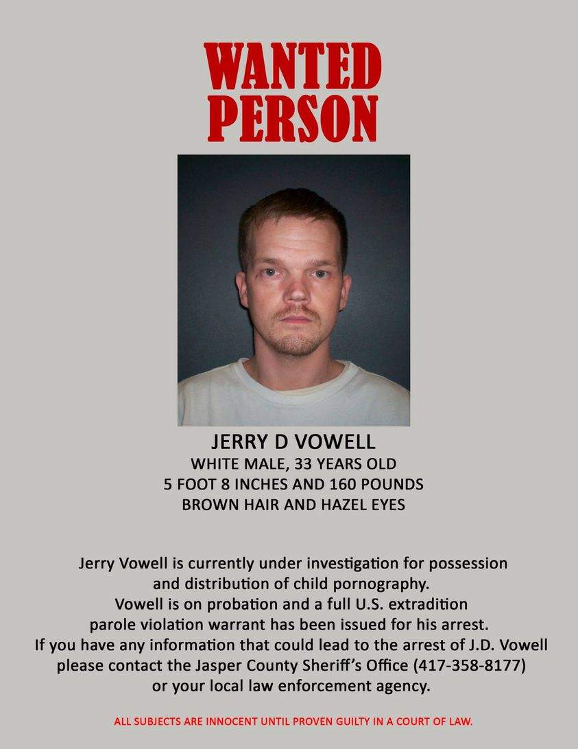 People make all kinds of excuses when they’re in trouble. This was the situation for Jerry Vowell, a 33-year-old Joplin resident, who contacted the police after the attached photo was posted. He claimed that the child porn downloaded wasn’t his because it was on his wife’s phone. They are currently getting a divorce. Vowell has a history of trouble with women , and he’s scheduled to go to trial in February on seven felony charges. Two of those involve him allegedly hitting two women with closed fists during two separate burglaries. If you’ve seen Vowell, contact the Jasper County Sheriff’s Office at 417-358-8177.