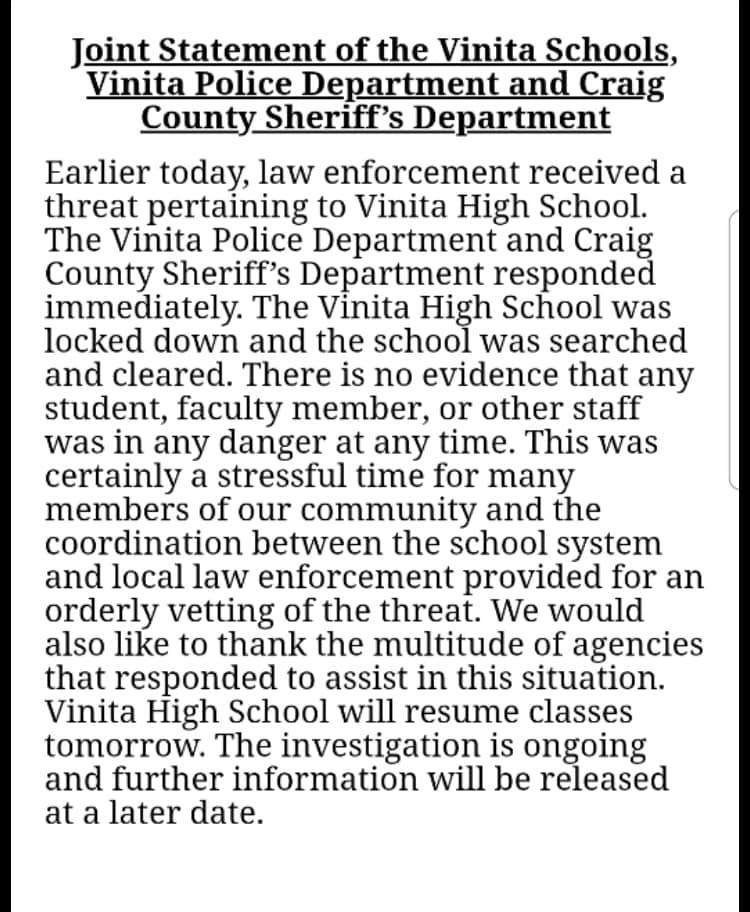 Vinita High School in northeastern Oklahoma was put on lockdown for several hours Monday after police got word of alleged threats towards students at the school.
