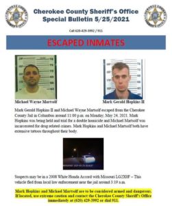 Mark Gerald Hopkins the Second and Michael Wayne Martsolf escaped from Cherokee County Jail in Columbus around 11:00 PM Monday, May 24.