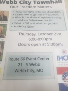 Items discussed at the event include a discussion of your rights in the face of mandates, learn how to get early treatment, questioning what the Missouri legislature is doing to address federal overreach, what critical race theory is and what you can do, and an audience Q and A.