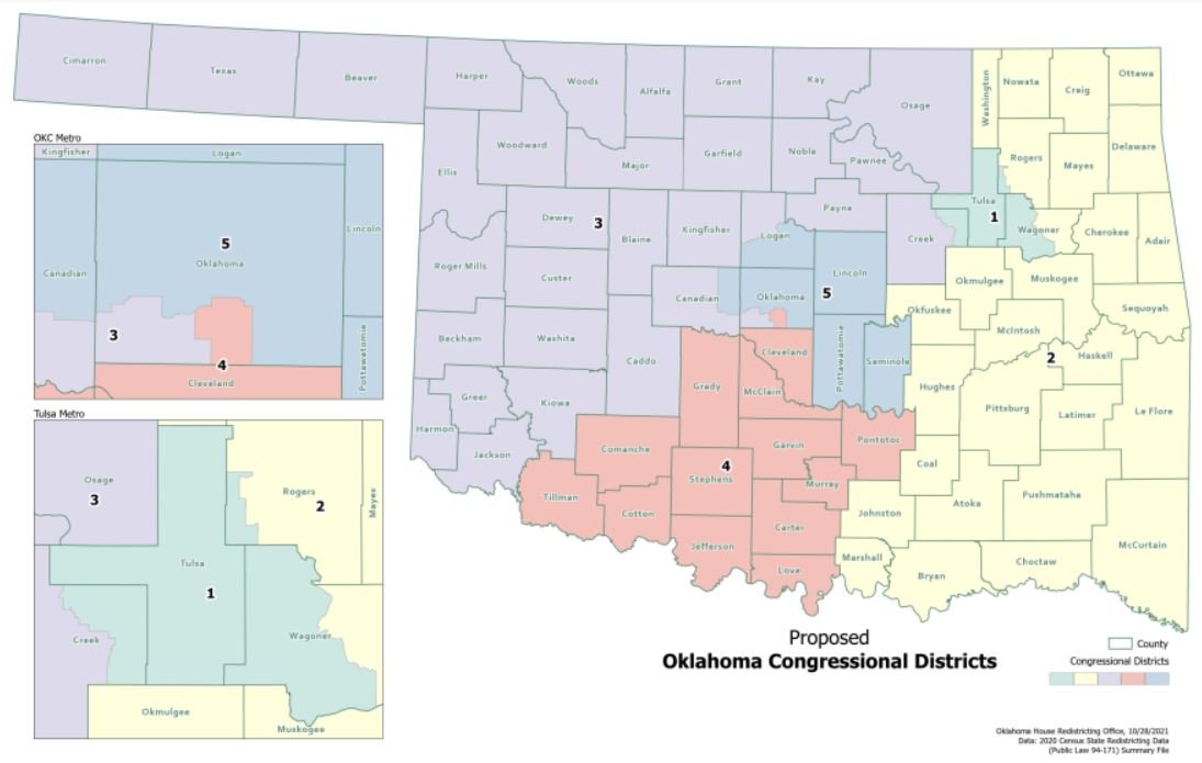 “Oklahoma City will continue to have one majority congressional district with CD-5 and representation in two others, as it has for decades," said Rep. Ryan Martinez, chairman of the House Redistricting Committee. “This is appropriate given the Oklahoma City metro area’s status as Oklahoma’s fastest-growing area, the public input received from many metro area communities, and statewide military base needs."