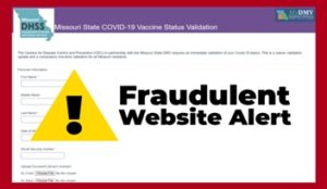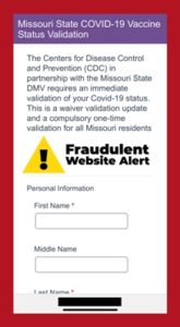 The text message requests that citizens visit a website to enter their social security number, name and date of birth, and upload photos of their Driver License to “validate” their “one-time Covid-19 Vaccine verification.” In an attempt to legitimize the site, logos of DHSS and the Missouri Department of Revenue’s myDMV portal appear along the top.