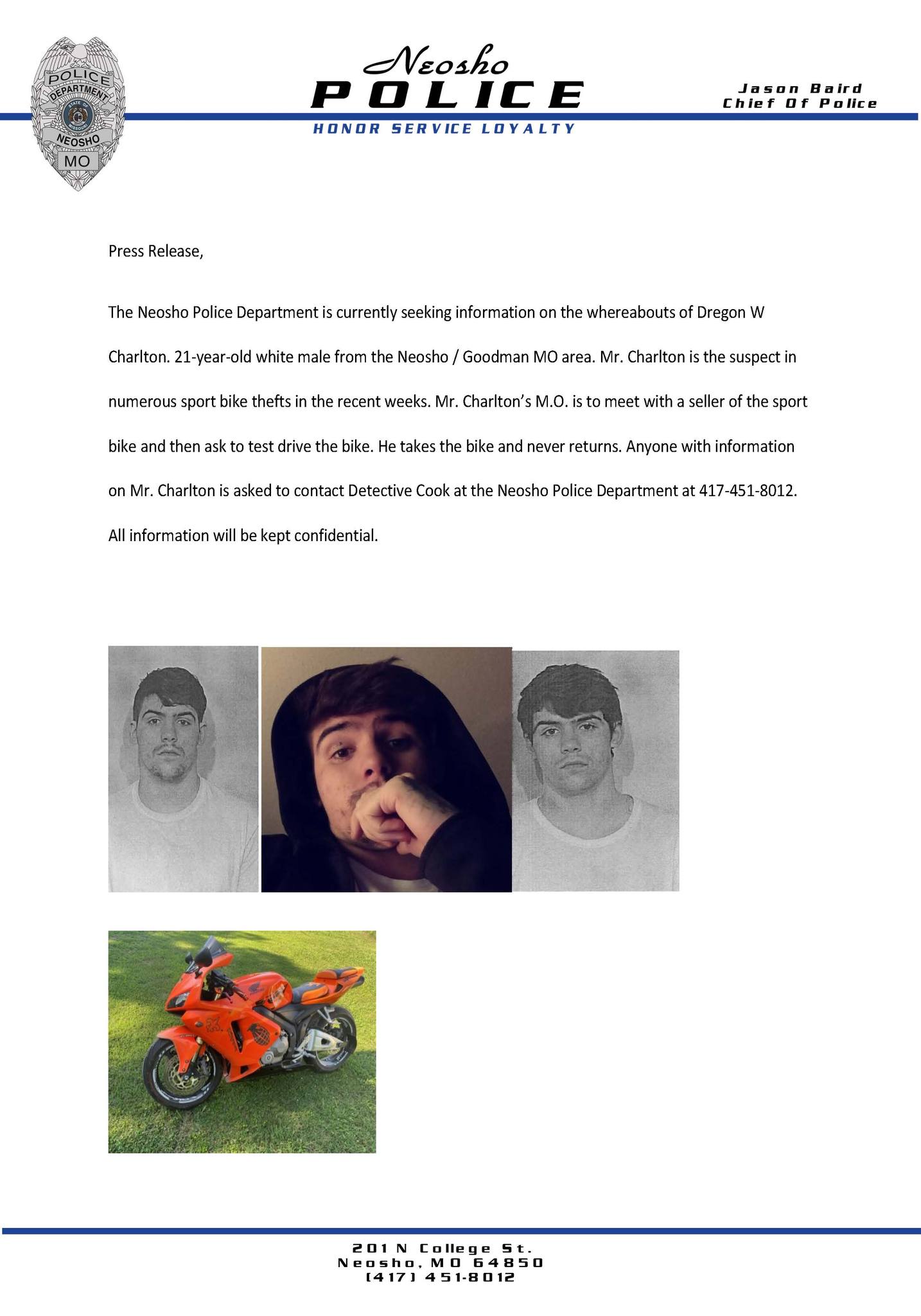 Police are looking for 21-year-old Dregon Charlton, who they say meets with a seller of the sports bike, then asks to test drive it. He then allegedly takes off and never returns.