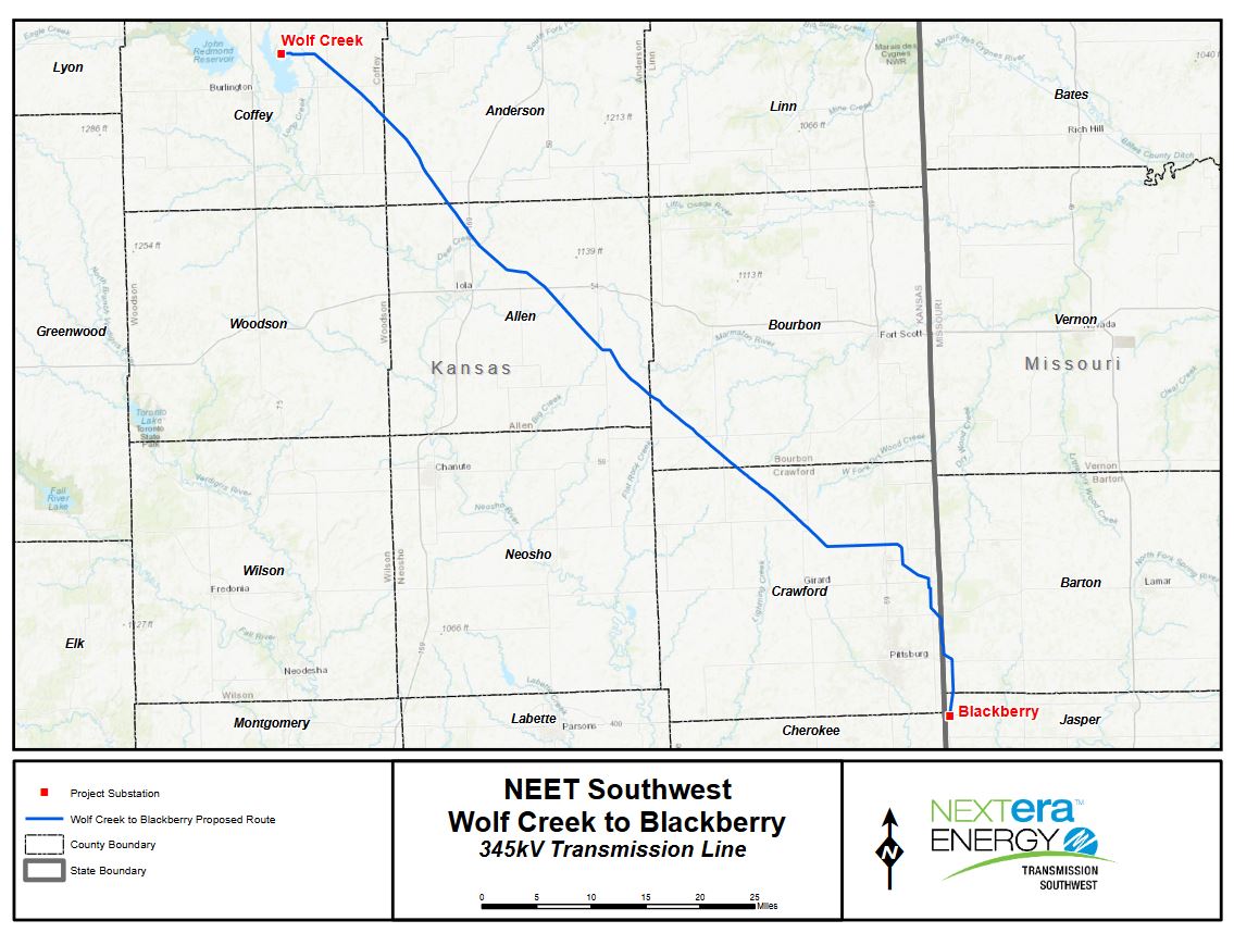 The company filed an application for the certificate in February in order to construct a 94-mile, 345 kV transmission line from Wolf Creek to the Blackberry Substation, less than one mile over the state line in Southwest Missouri. The proposed line runs through five Kansas counties: Coffey, Anderson, Allen, Bourbon and Crawford.