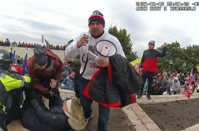 According to court documents, on Jan. 6, 2021, Bard was standing on a ledge on the Upper West Terrace of the U.S. Capitol, where officers, including Officer M.G., had formed a police line as a barrier. Metropolitan Police Department (MPD) Body Worn Camera (BWC) footage showed that at approximately 3:30 p.m., Bard was walking on top of the ledge and carrying a megaphone and, shortly thereafter, could be heard yelling “Move! Move! Move! We gotta push! We gotta push! Let’s go! We gotta go! Let’s go!” Bard then turned directly to Officer M.G. and, as he yelled “let’s push!,” Bard pushed Officer M.G. Officer M.G. repelled Bard’s assault, and Bard fell backwards.