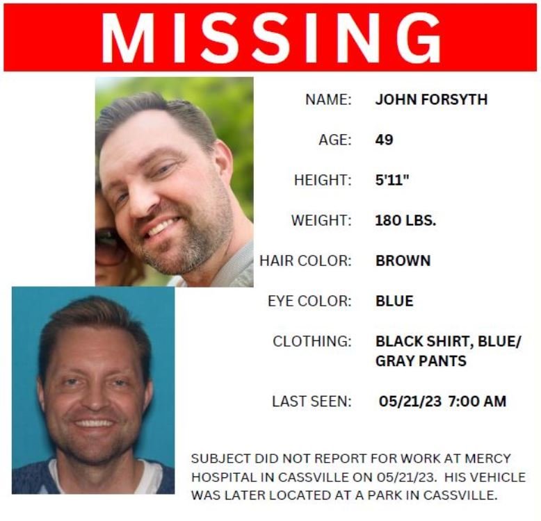 Police say 49-year-old John Forsyth was last seen Sunday morning and was reported missing after he did not report for work at Mercy Hospital in Cassville.