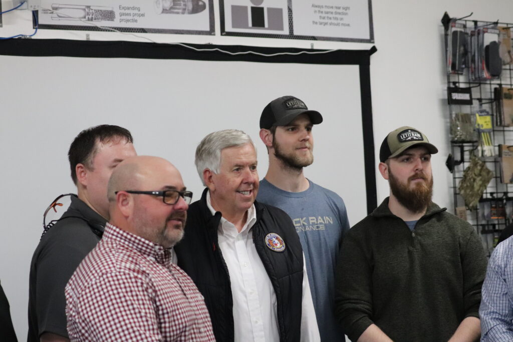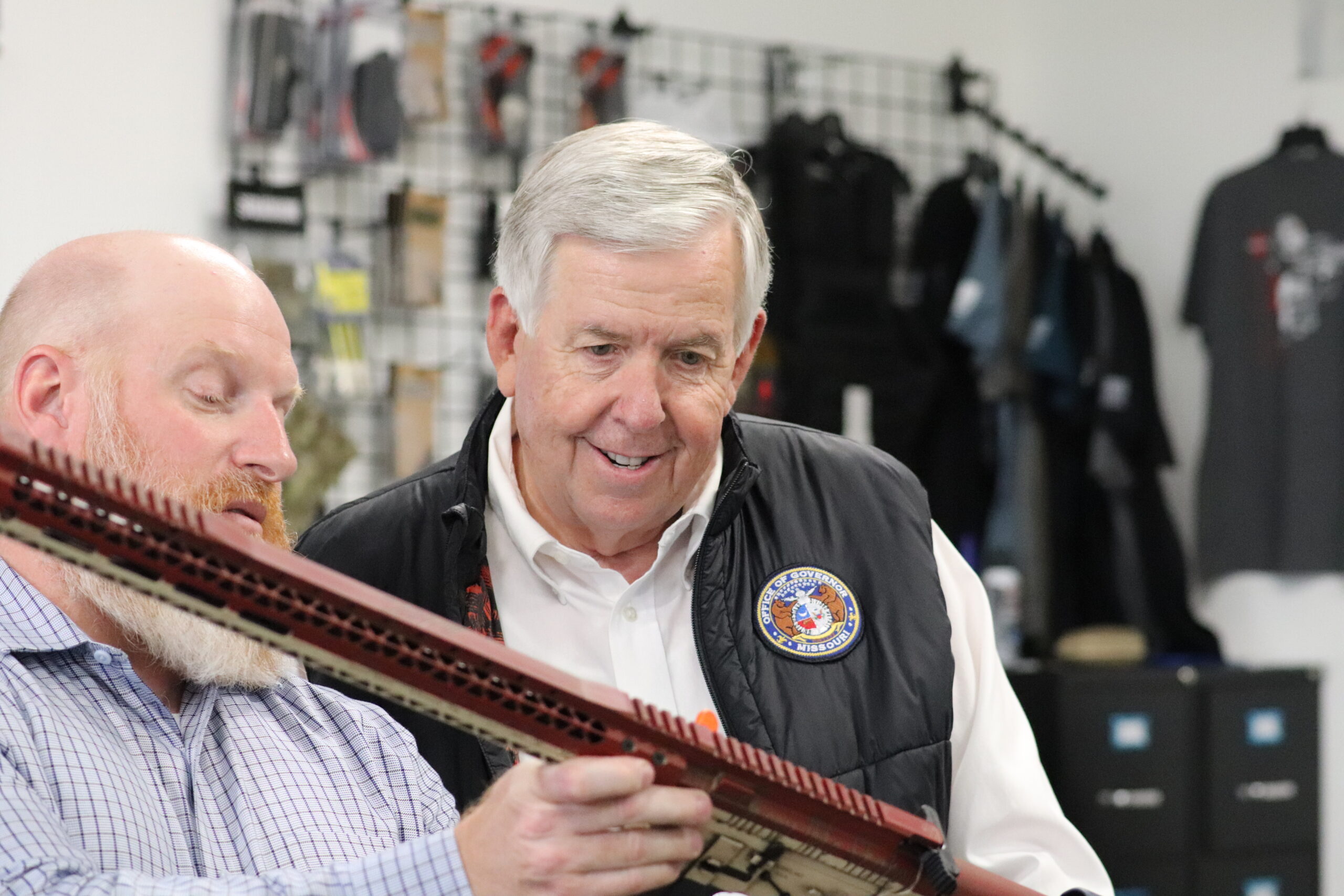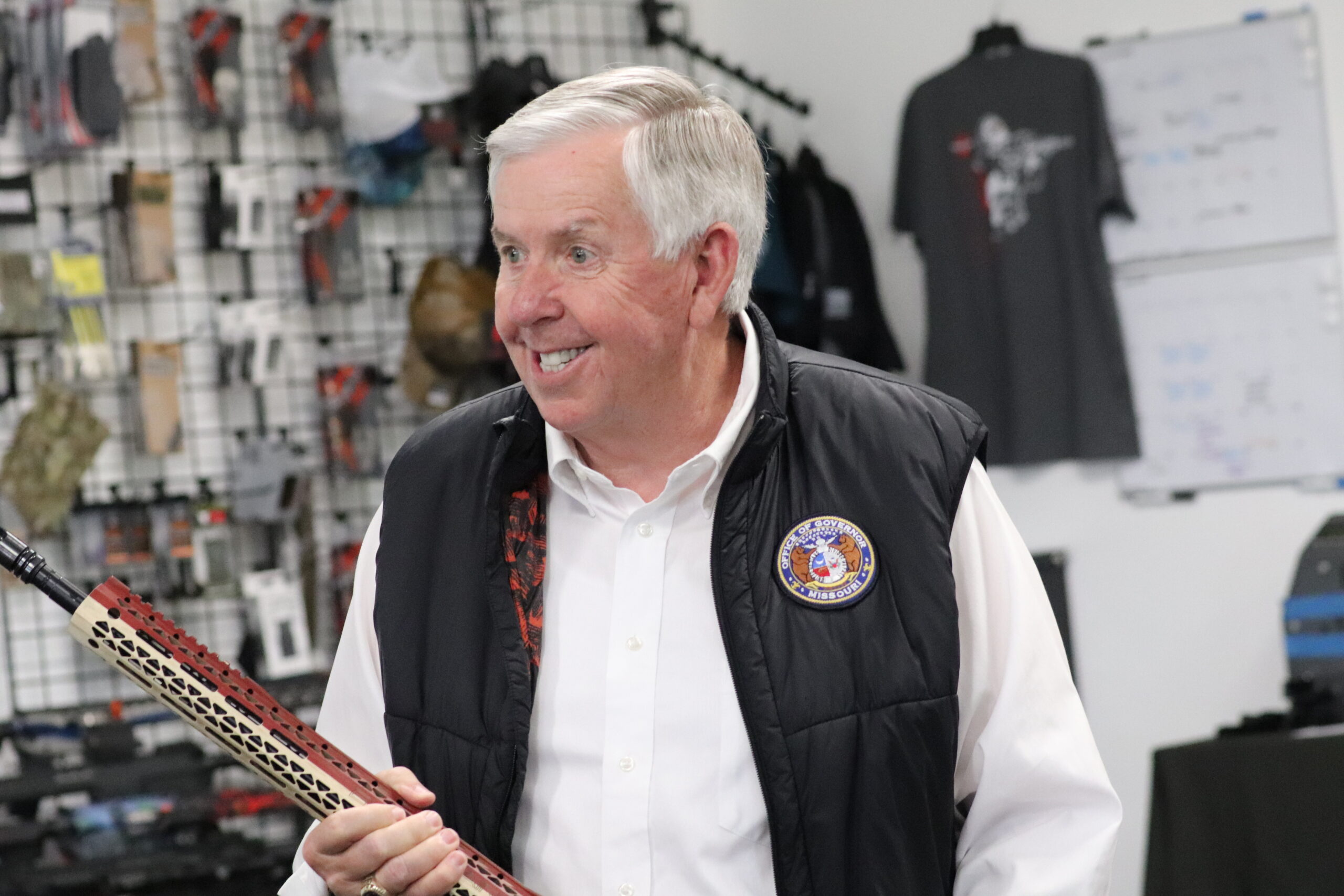 Missouri Governor Mike Parson made a trip to Black Rain Ordinance in Neosho Thursday morning where he talked about the legislative session and was even presented with his own custom gun.