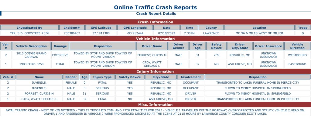 The Missouri State Highway Patrol says the accident happened on Highway 96, six miles west of Miller, when 32-year-old Wyatt Seelaus Cady‘s truck went off the road, overcorrected, then crossed the center line and hit a van that the baby girl was riding in.