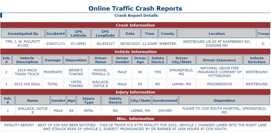 The Missouri State Highway Patrol says the crash happened when 64-year-old Doyle E. Wallace changed lanes and struck the back of a trash truck.