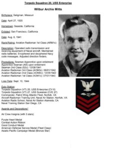 Aviation radioman 1st Class Wilbur Archie Mitts, who was shot down over Palau in the south Pacific during World War II, will be buried on Sept. 11th in Mission Memorial Park Cemetery, Seaside, California.