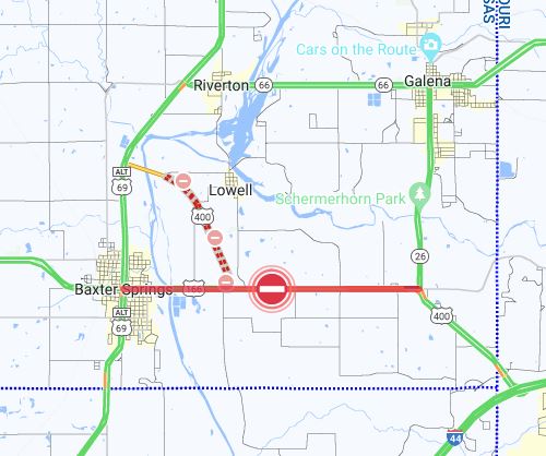 In conjunction with opening of U.S. 166, the existing U.S. 166/K-26 junction will be closed to traffic. The signed detour for northbound K-26 will follow the new alignment of U.S. 166/400 west to Baxter Springs, then continue north on U.S. 69A to K-66 and east on K-66 to Galena. Southbound K-26 traffic should take the same route in the opposite direction.