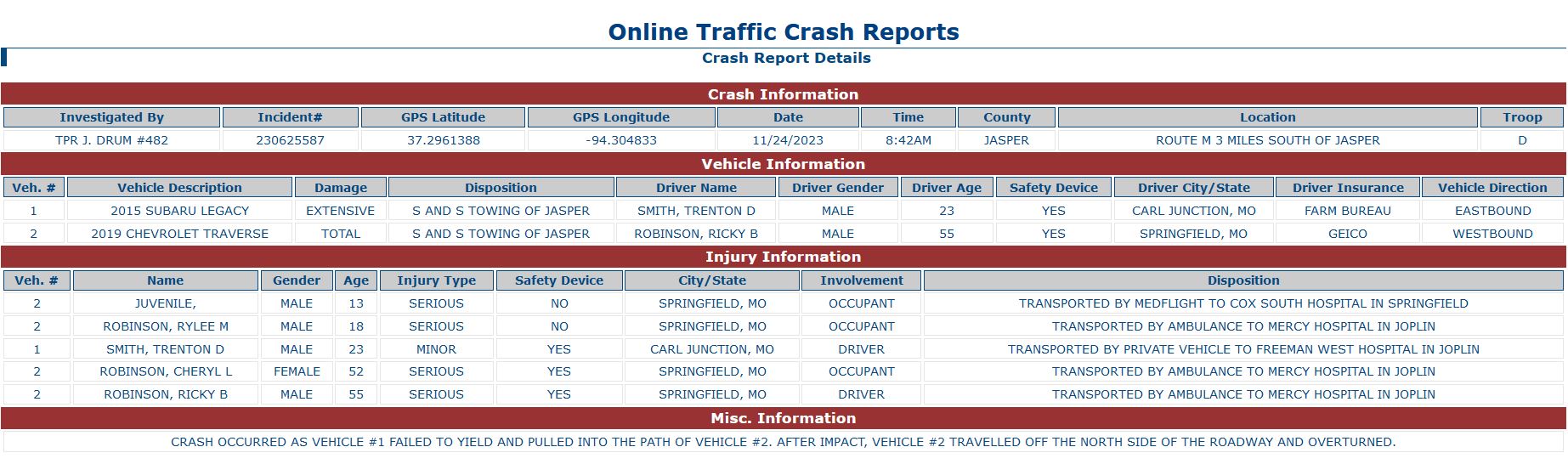 55-year-old Ricky B. Robinson, 52-year-old Cheryl L. Robinson and 18-year-old Rylee M. Robinson all suffered serious injures and were taken to a Joplin hospital.