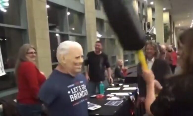 The Friday fundraiser featured 1970s rocker Ted Nugent, known for his backing of gun rights, hard-right political views and support for Trump, with tickets ranging from $90 for students to $300 for premier seats. The mannequin with the Biden mask also wore a “Let’s Go Brandon” T-shirt, using a slogan that’s become conservative code for a vulgar insult directed at the Democratic president.