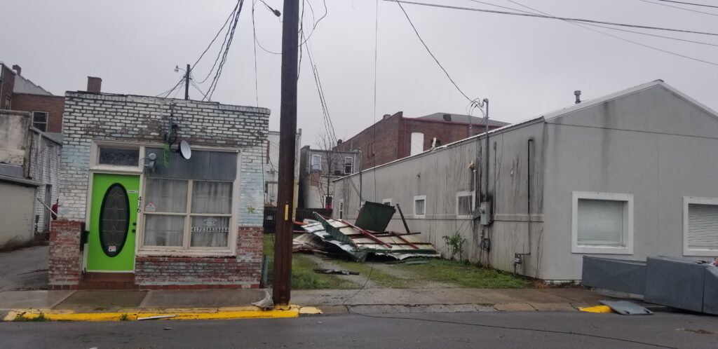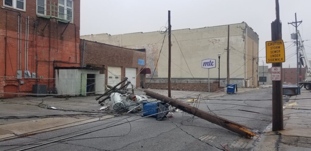 Among the destruction was roof damage to several buildings, structural damage, storefront windows blown out and several powerline poles down.