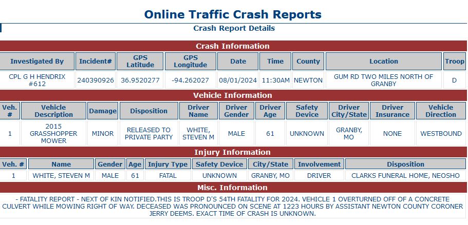 The Missouri State Highway Patrol says the riding lawnmower that 61-year-old Steven M. White was operating overturned off a concrete culvert.