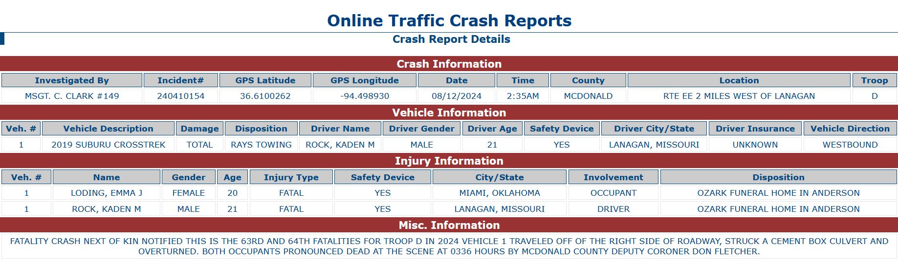 UPDATE: This story now reflects the latest information from the Highway Patrol, who has identified the second victim as 20-year-old Emma Loding, of Miami, Oklahoma.