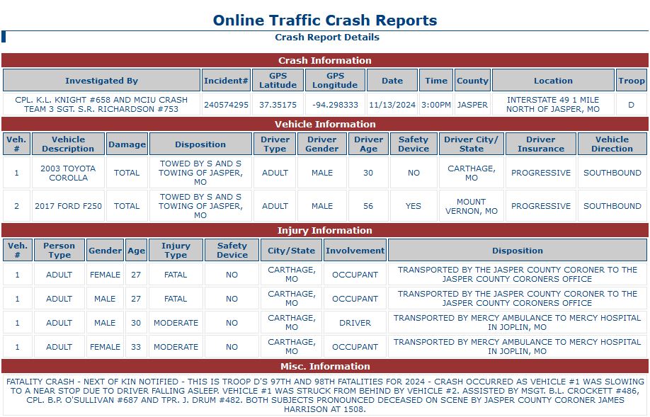The Missouri State Highway Patrol says as a Toyota Corolla slowed to a near stop on the interstate, a large pickup truck rear-ended the vehicle, killing two people in the backseat.