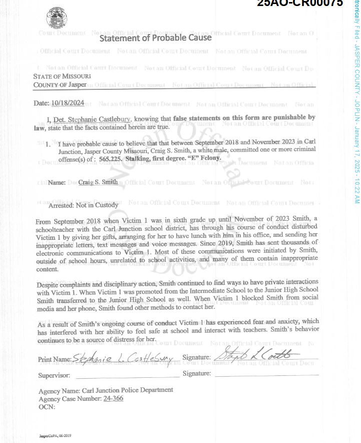 Carl Junction Police took 52-year-old Craig S. Smith into custody after an extensive investigation into inappropriate behavior toward a student.