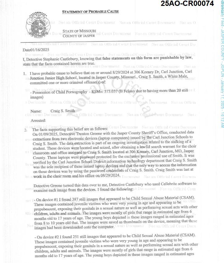 The Carl Junction School District website last listed Smith as a Junior High Vocal Music teacher.