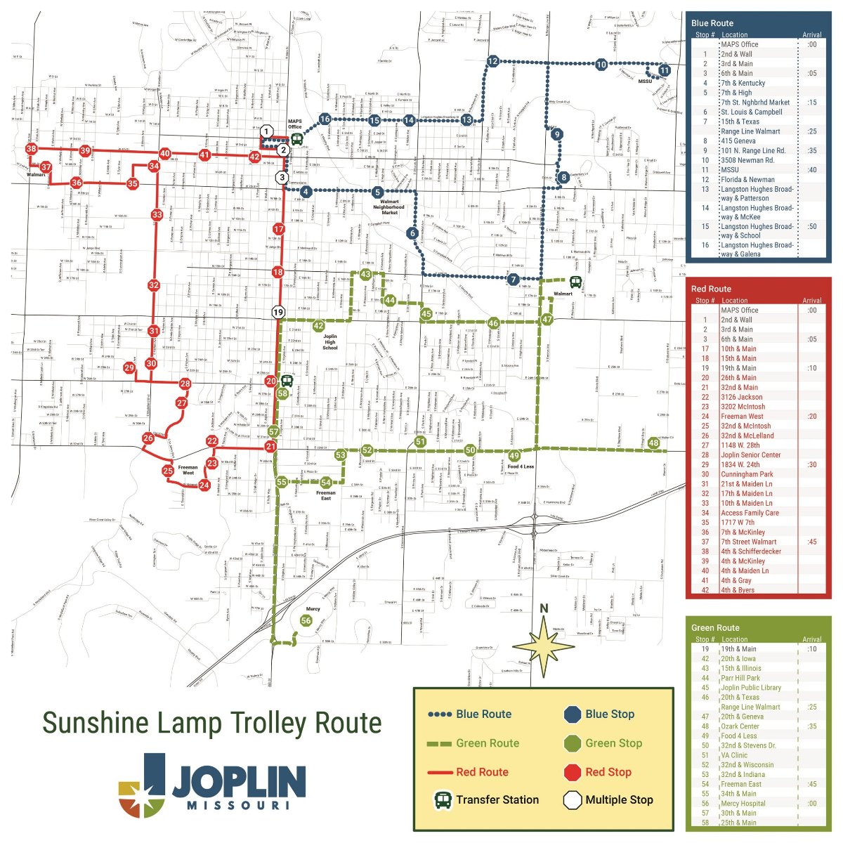 Starting today, Monday, February 3, citizens needing to go to the doctor, grocery store, work, and other places in Joplin will again have a fixed-route transportation option as the City relaunches the Sunshine Lamp Trolley.