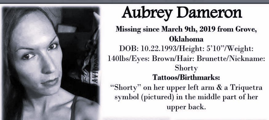 Aubrey was last seen during the early morning hours on March 9, 2019, leaving her mother's house in the Grove area, leaving her purse at the residence, with plans to meet someone.