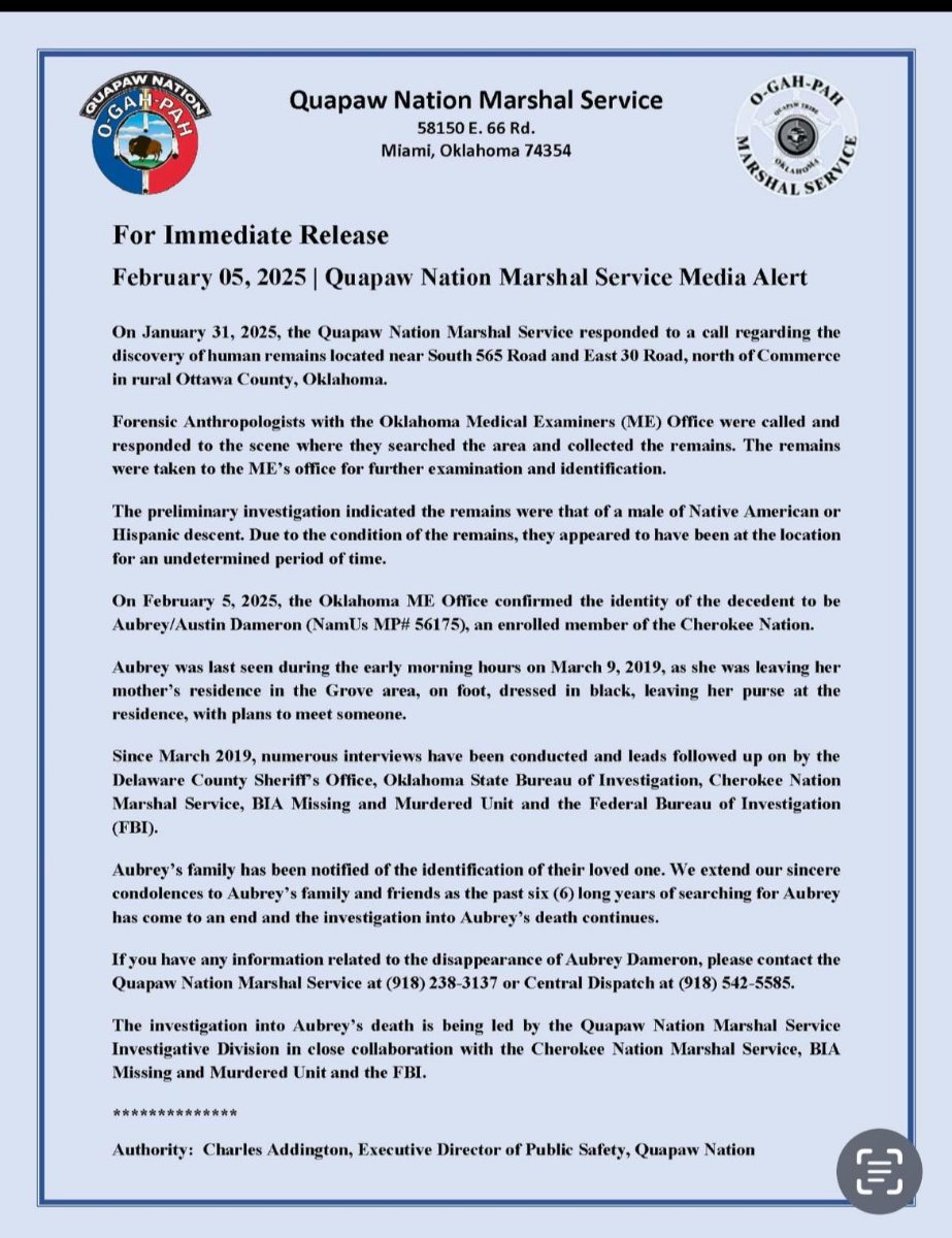 The investigation into Aubrey's death is being led by the Quapaw Nation Marshal Service Investigative Division in close collaboration with the Cherokee Nation Marshal Service, BIA Missing and Murdered Unit and the FBI.