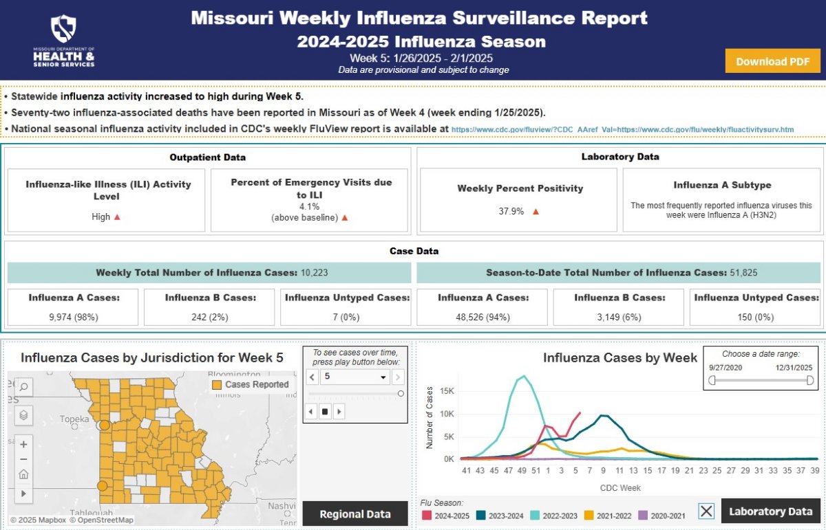 How much of an uptick have we seen? Well, we are currently in a stretch that has produced more documented influenza cases this week than at any point last year. Currently, there have been more than 15,000 cases (15, 360) of the flu reported in Missouri during Week 5 of the year. That number trumps the highest totals we saw in Week 8 (9,640) and Week 9 (9,517) of last year.
