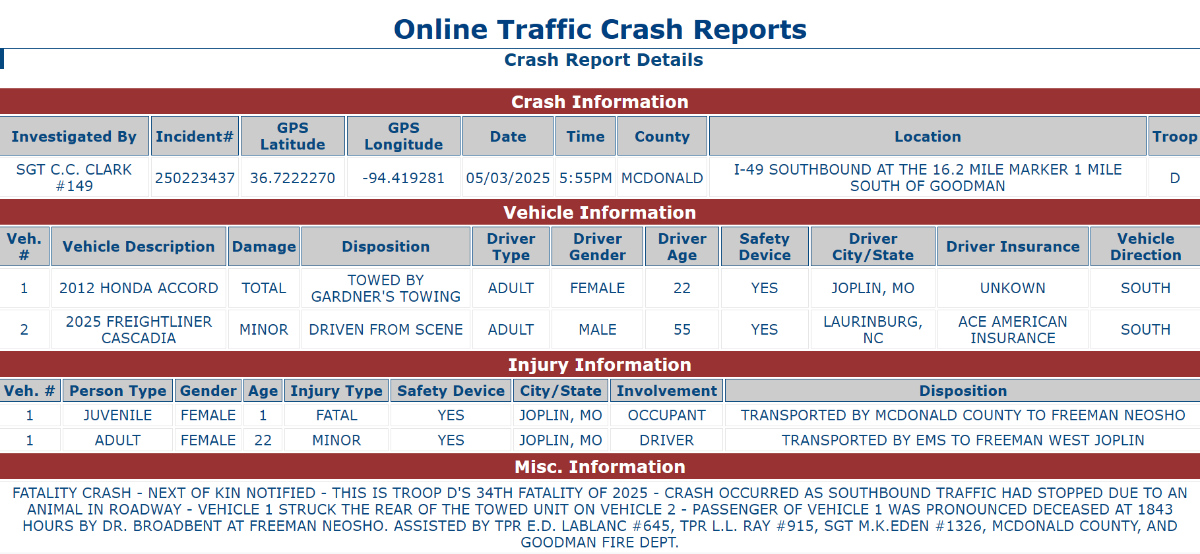 A fatal crash on Interstate 49 Saturday evening claimed the life of a one-year-old girl from Joplin.