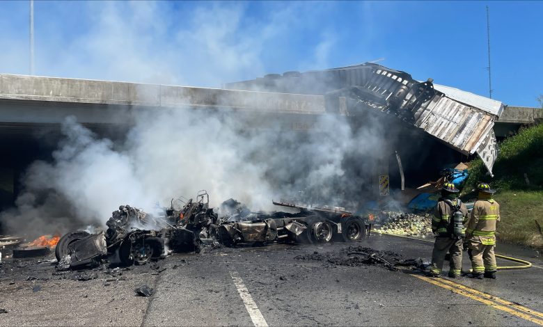 The driver of the passenger car, identified as Nurbin Remigio Hernandez-Guzman, lost control and struck the semi, causing the semi-truck to leave the roadway and go off a bridge, down onto Highway 60.